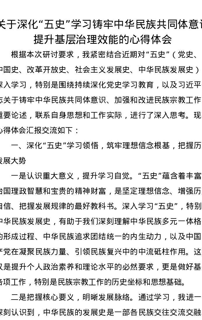 关于深化“五史”学习铸牢中华民族共同体意识提升基层治理效能的心得体会