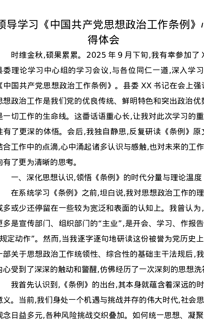 领导学习《中国共产党思想政治工作条例》心得体会