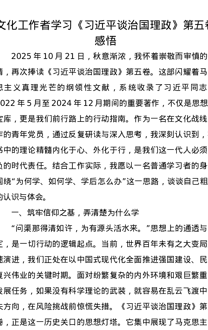 文化工作者学习《习近平谈治国理政》第五卷心得感悟
