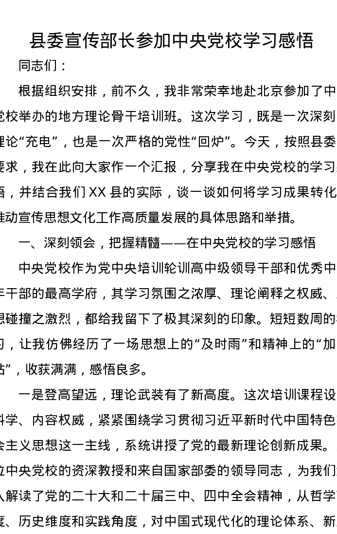 县委宣传部长参加中央党校学习心得感悟