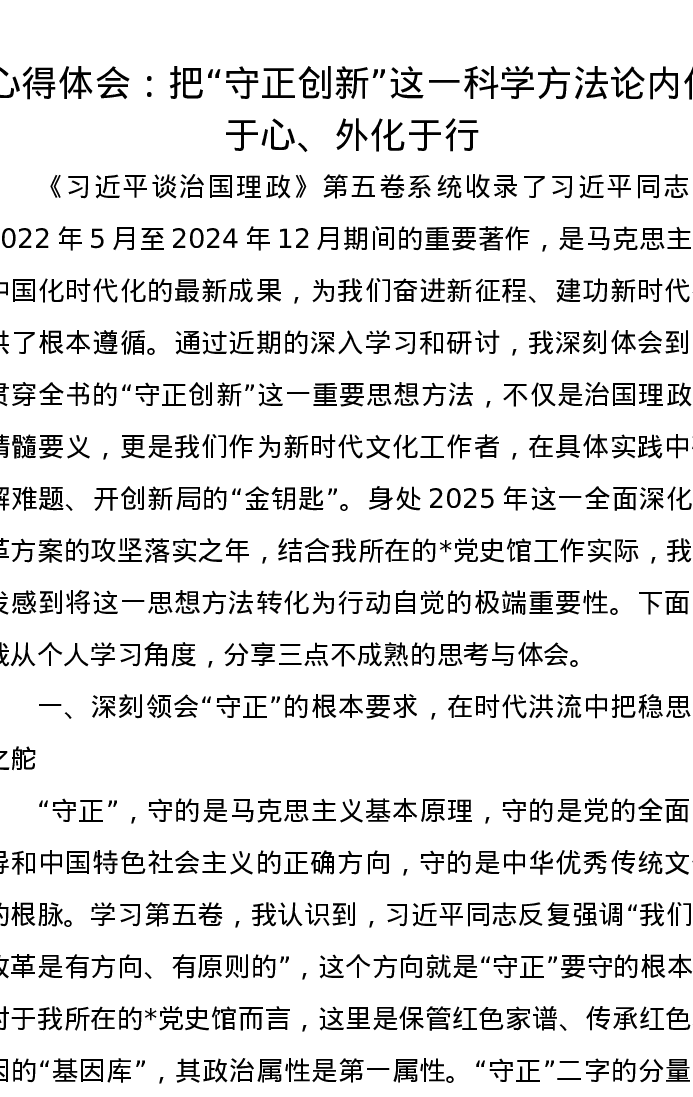 心得体会:把“守正创新”这一科学方法论内化于心、外化于行