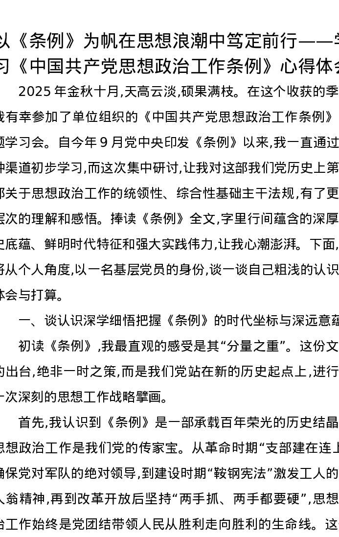 以《条例》为帆在思想浪潮中笃定前行——学习《中国共产党思想政治工作条例》心得体会