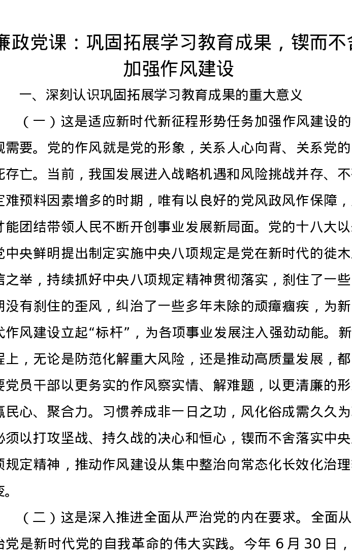 廉政党课讲稿:巩固拓展学习教育成果,锲而不舍加强作风建设