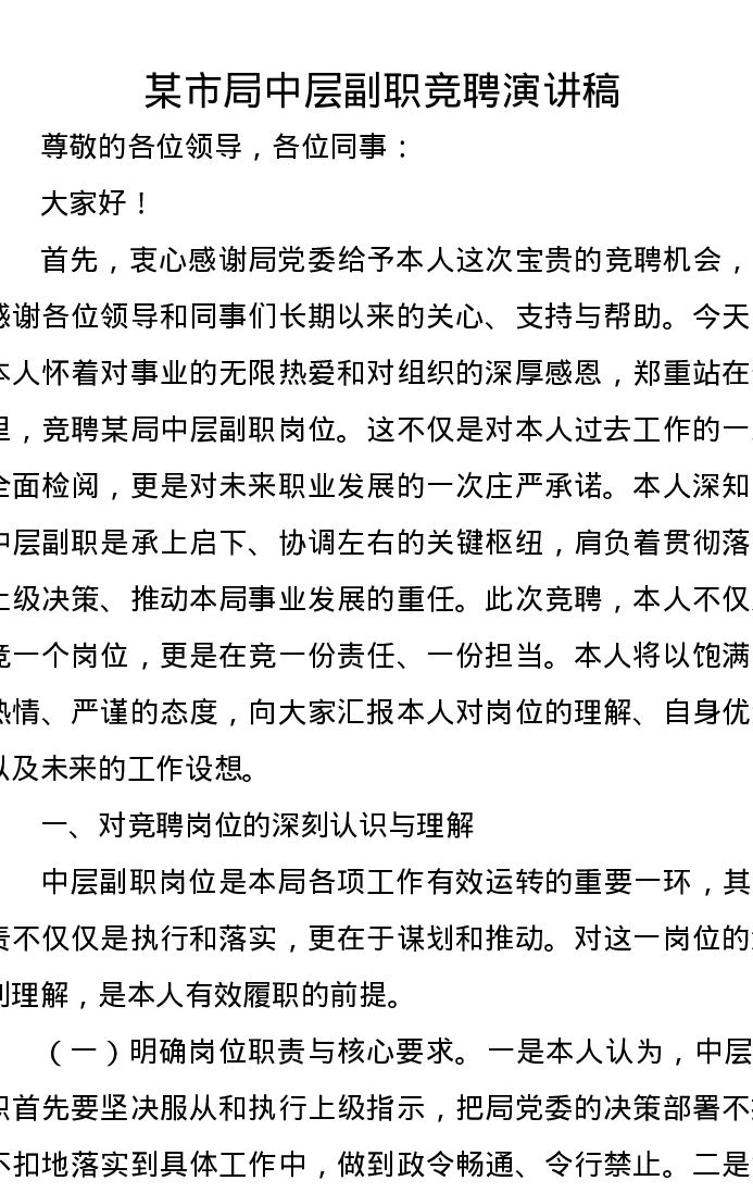 某市局中层副职竞聘演讲稿