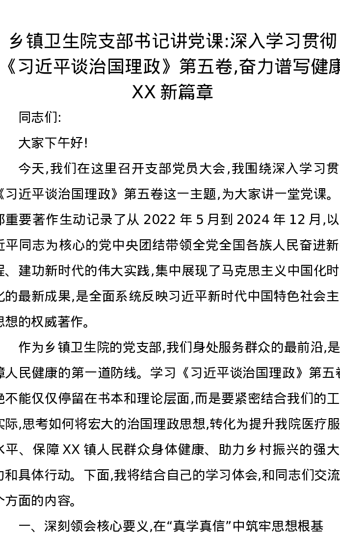 乡镇卫生院支部书记讲党课深入学习贯彻《习近平谈治国理政》第五卷,奋力谱写健康XX新篇章