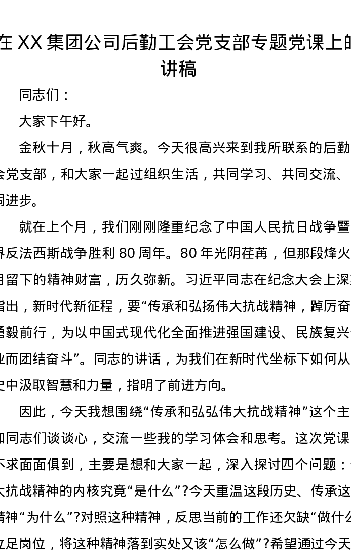 在XX集团公司后勤工会党支部专题党课上的讲稿