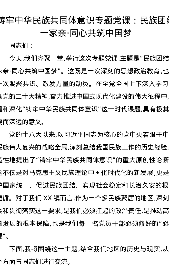 铸牢中华民族共同体意识专题党课讲稿:民族团结一家亲·同心共筑中国梦