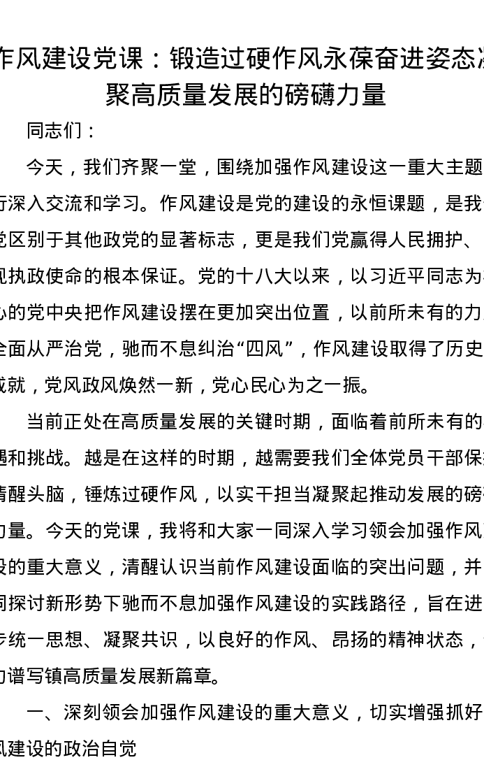 作风建设党课:锻造过硬作风 永葆奋进姿态 凝聚高质量发展的磅礴力量