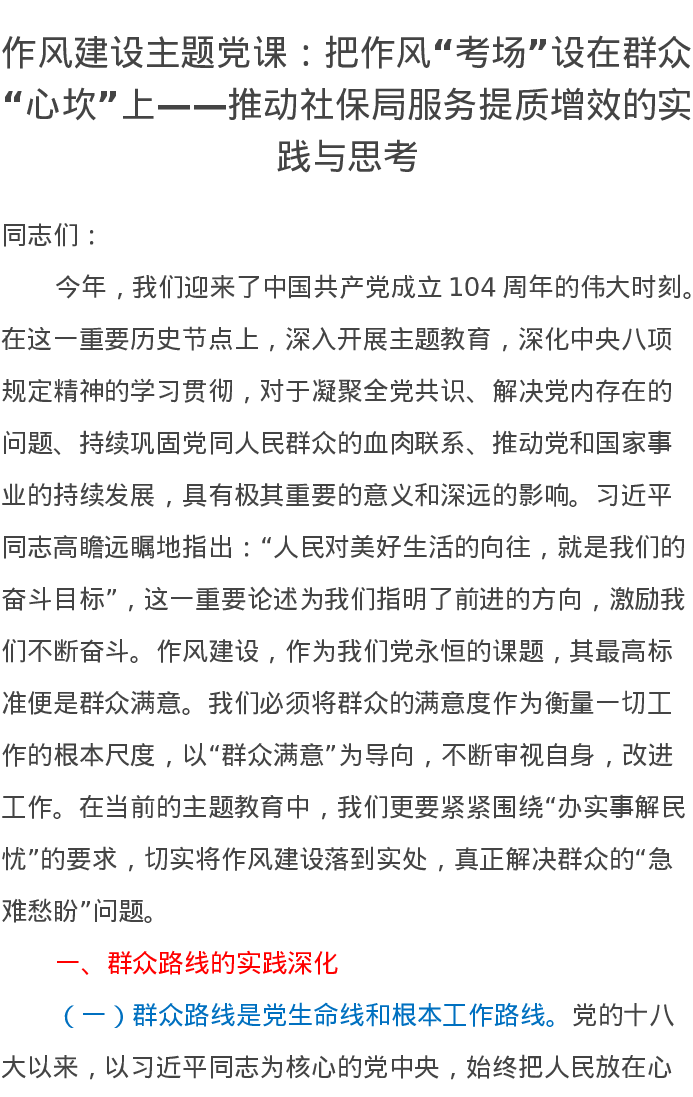 作风建设主题党课讲稿:把作风“考场”设在群众“心坎”上——推动社保局服务提质增效的实践与思考