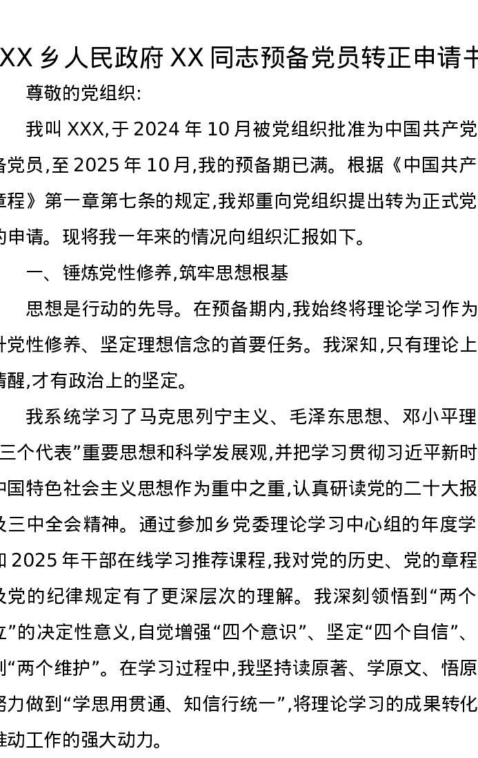 XX乡人民政府XX同志预备党员转正申请书