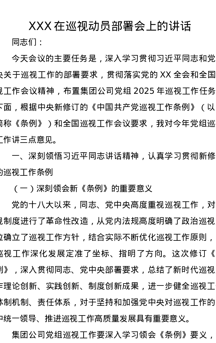 XXX在巡视动员部署会上的讲话
