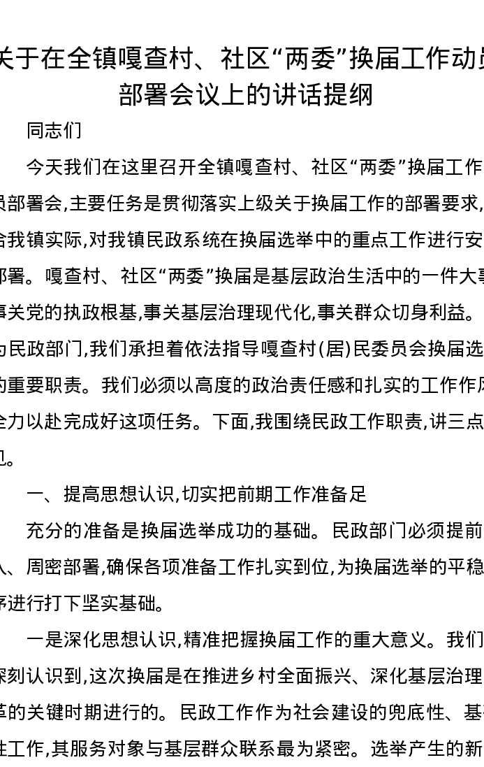 关于在全镇嘎查村、社区“两委”换届工作动员部署会议上的讲话提纲