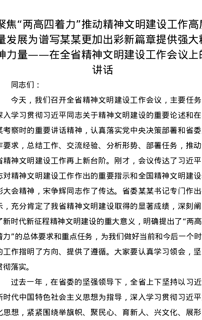 聚焦“两高四着力”推动精神文明建设工作高质量发展为谱写某某更加出彩新篇章提供强大精神力量——在全省精神文明建设工作会议上的讲话