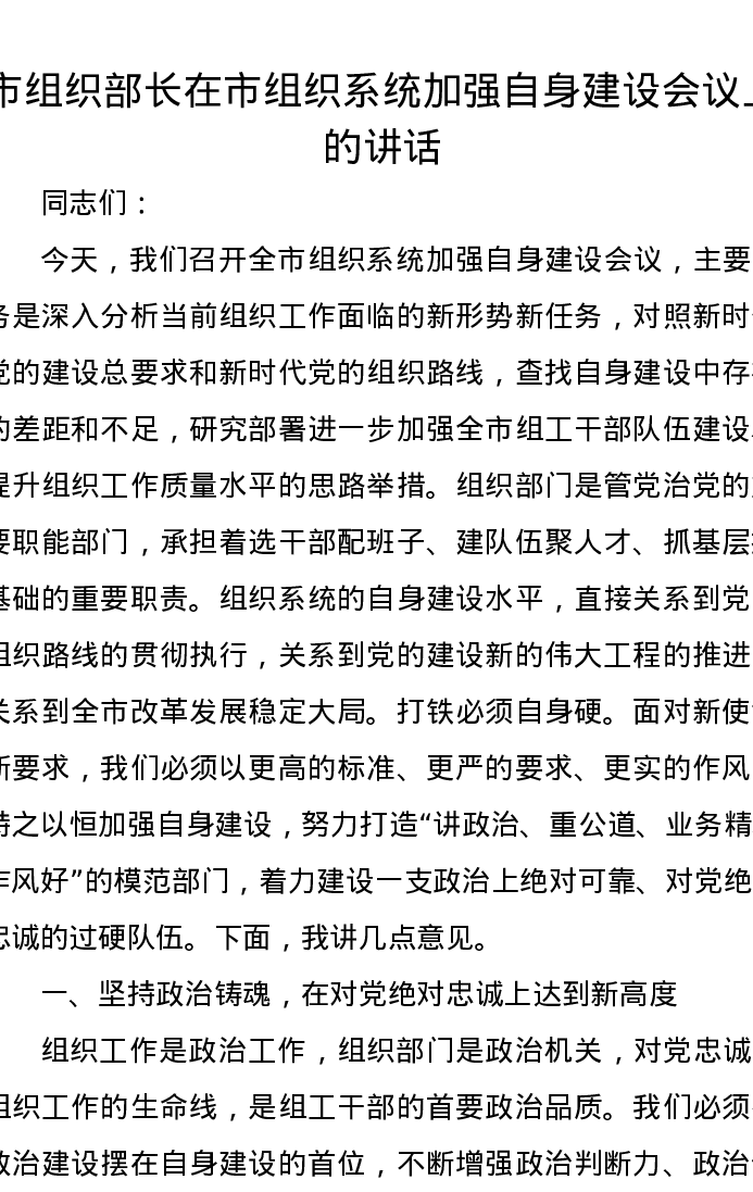 市组织部长在市组织系统加强自身建设会议上的讲话
