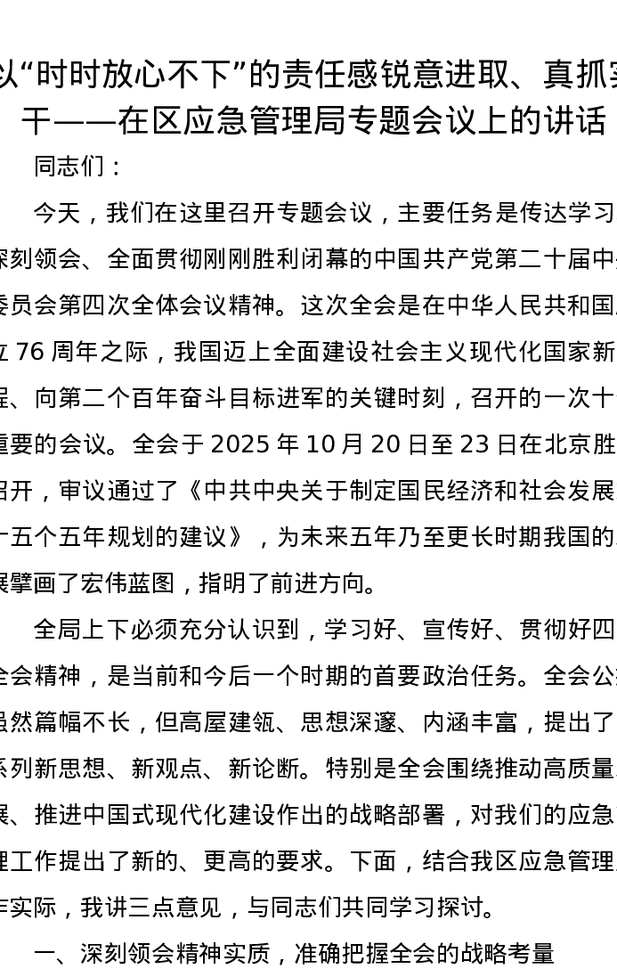以“时时放心不下”的责任感锐意进取、真抓实干——在区应急管理局专题会议上的讲话