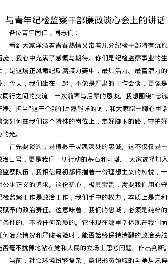 与青年纪检监察干部廉政谈心会上的讲话