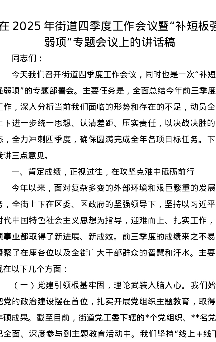 在2025年街道四季度工作会议暨“补短板强弱项”专题会议上的讲话稿
