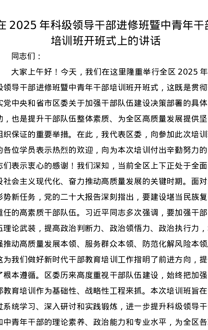在2025年科级领导干部进修班暨中青年干部培训班开班式上的讲话