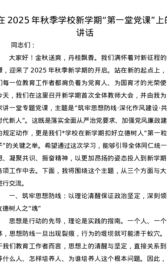 在2025年秋季学校新学期“第一堂党课”上的讲话