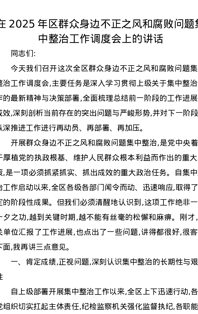 在2025年区群众身边不正之风和腐败问题集中整治工作调度会上的讲话