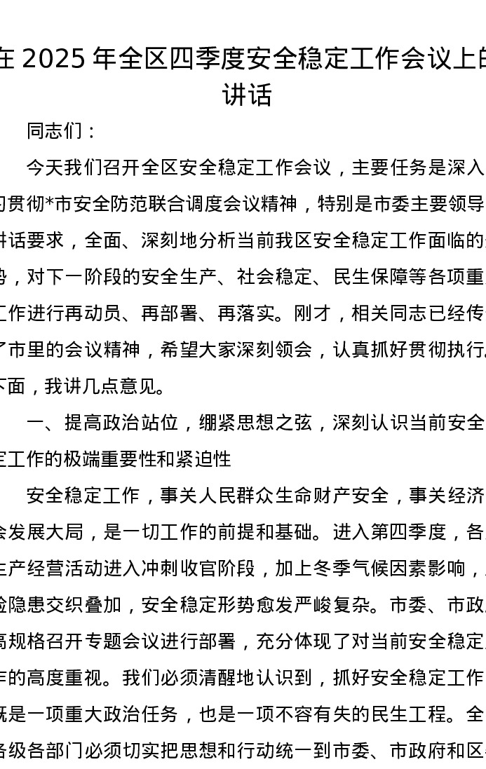 在2025年全区四季度安全稳定工作会议上的讲话