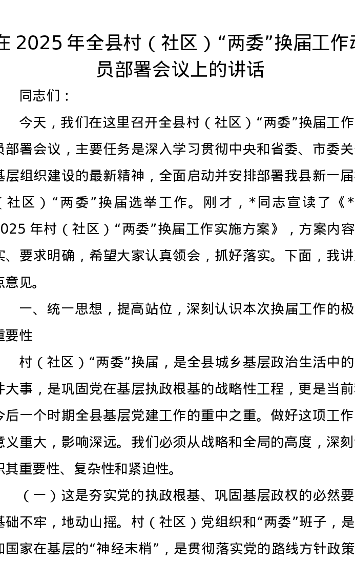 在2025年全县村(社区)“两委”换届工作动员部署会议上的讲话