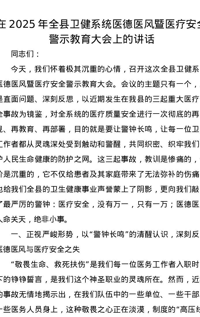 在2025年全县卫健系统医德医风暨医疗安全警示教育大会上的讲话