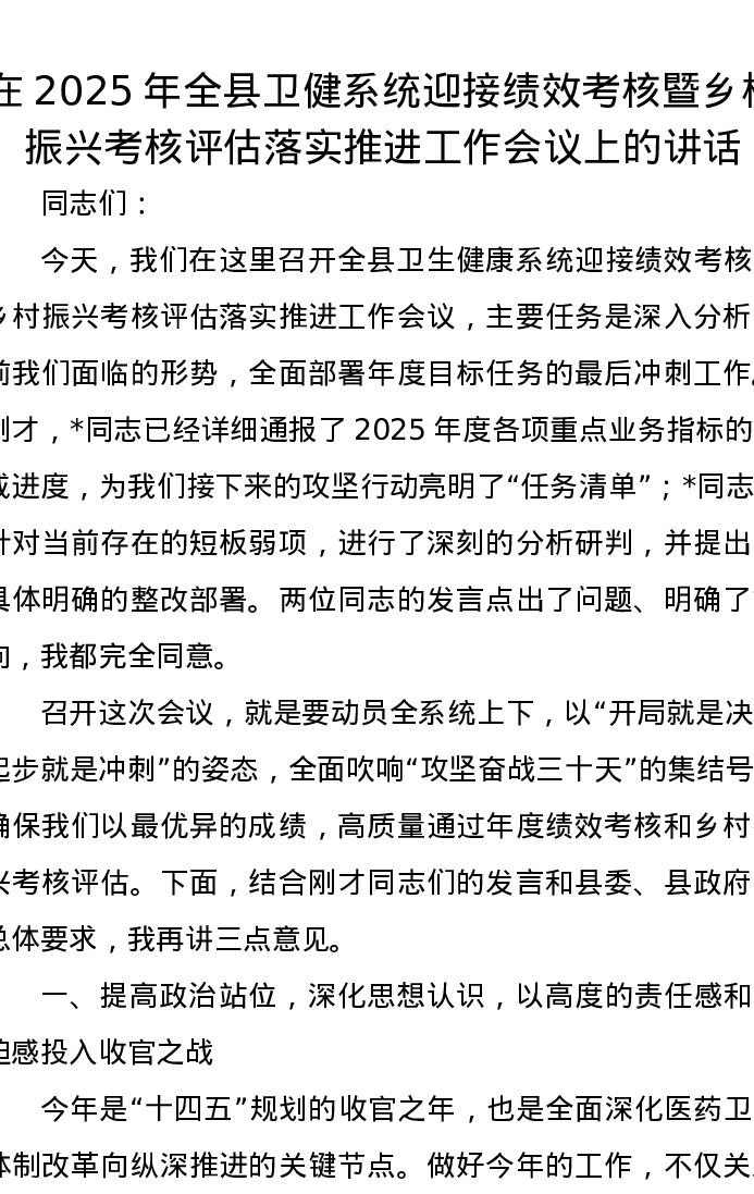在2025年全县卫健系统迎接绩效考核暨乡村振兴考核评估落实推进工作会议上的讲话