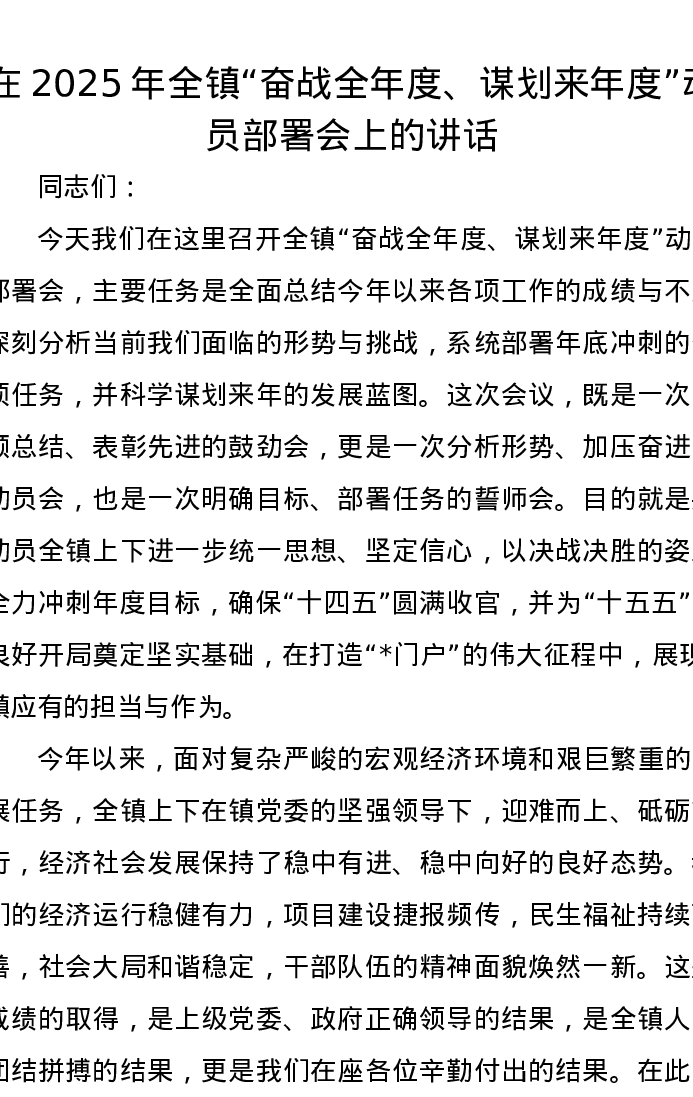 在2025年全镇“奋战全年度、谋划来年度”动员部署会上的讲话