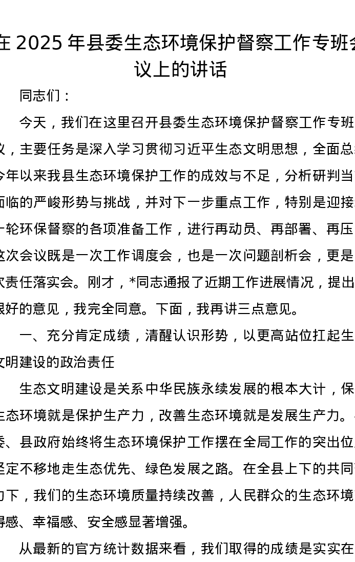 在2025年县委生态环境保护督察工作专班会议上的讲话