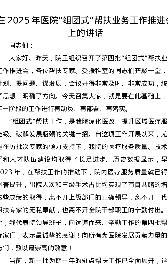 在2025年医院“组团式”帮扶业务工作推进会上的讲话