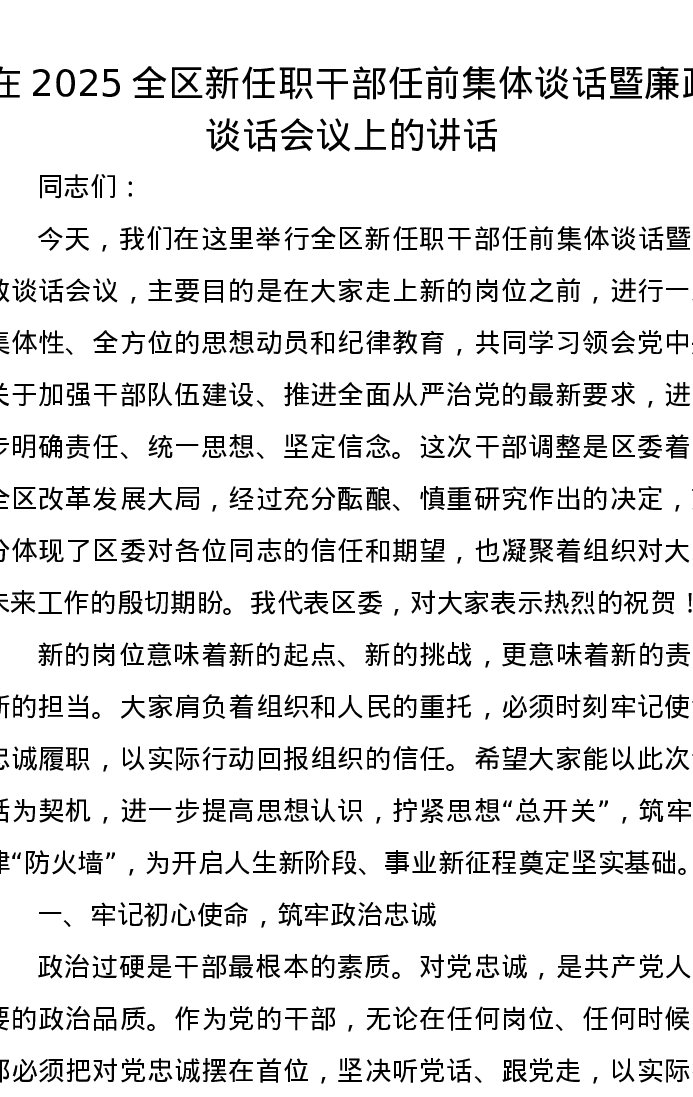 在2025全区新任职干部任前集体谈话暨廉政谈话会议上的讲话