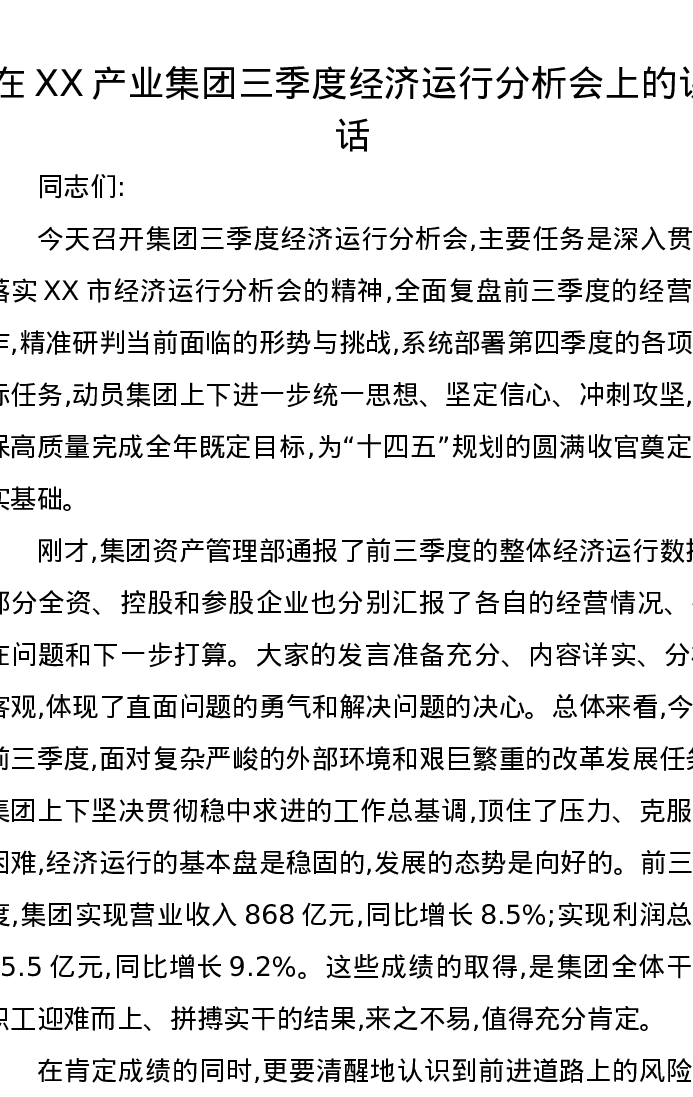 在XX产业集团三季度经济运行分析会上的讲话
