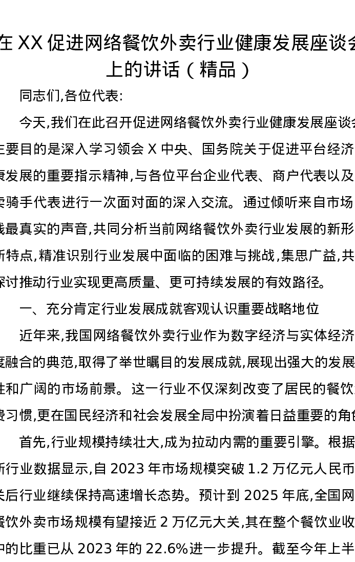 在XX促进网络餐饮外卖行业健康发展座谈会上的讲话