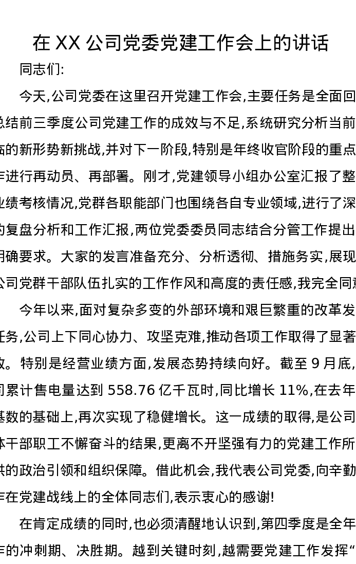 在XX公司党委党建工作会上的讲话
