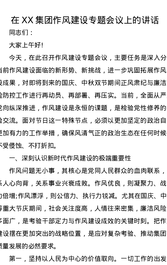 在XX集团作风建设专题会议上的讲话