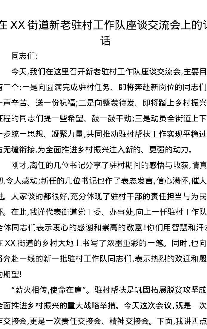 在XX街道新老驻村工作队座谈交流会上的讲话