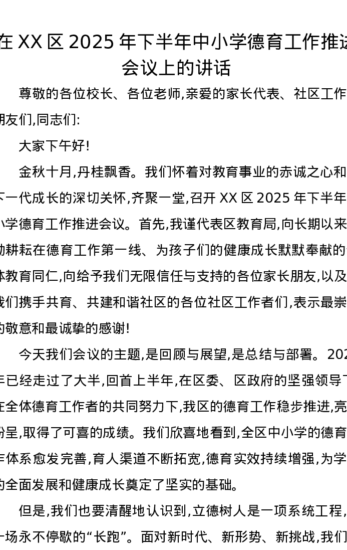 在XX区2025年下半年中小学德育工作推进会议上的讲话