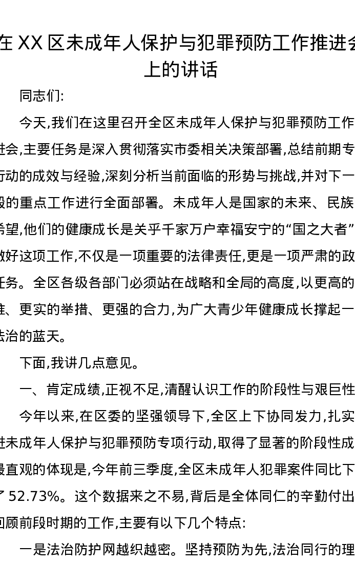 在XX区未成年人保护与犯罪预防工作推进会上的讲话