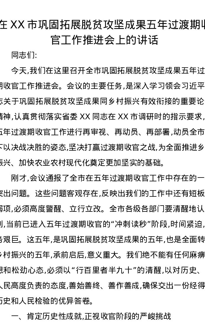 在XX市巩固拓展脱贫攻坚成果五年过渡期收官工作推进会上的讲话