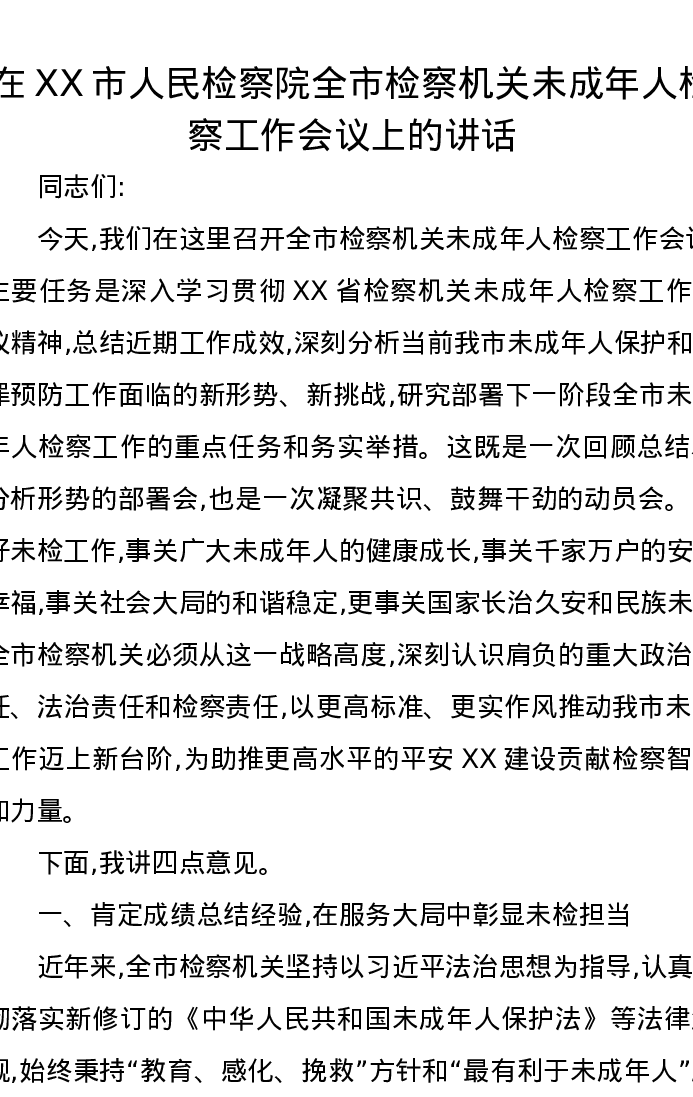 在XX市人民检察院全市检察机关未成年人检察工作会议上的讲话