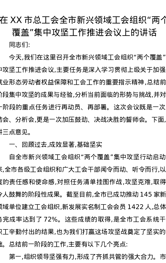 在XX市总工会全市新兴领域工会组织“两个覆盖”集中攻坚工作推进会议上的讲话