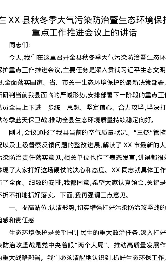 在XX县秋冬季大气污染防治暨生态环境保护重点工作推进会议上的讲话