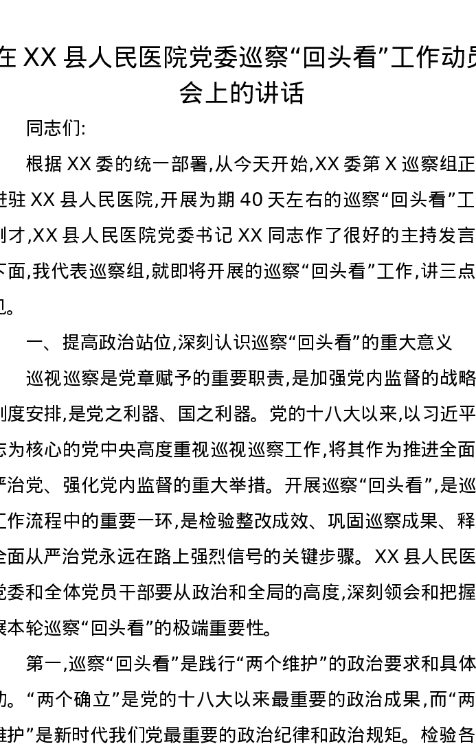在XX县人民医院党委巡察“回头看”工作动员会上的讲话