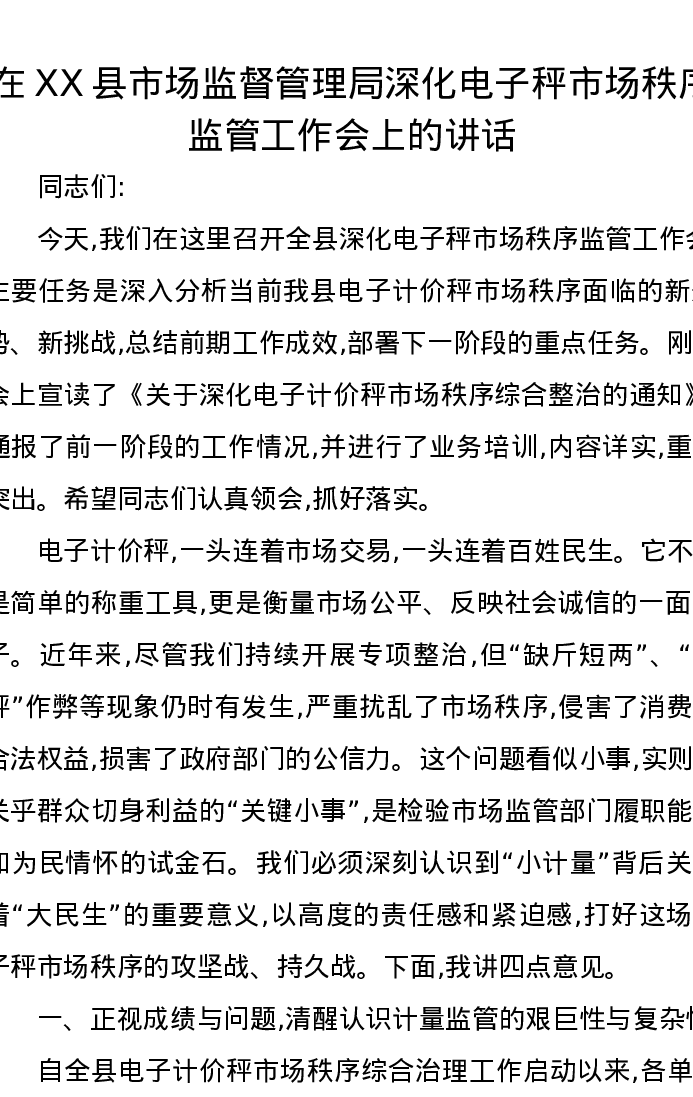 在XX县市场监督管理局深化电子秤市场秩序监管工作会上的讲话