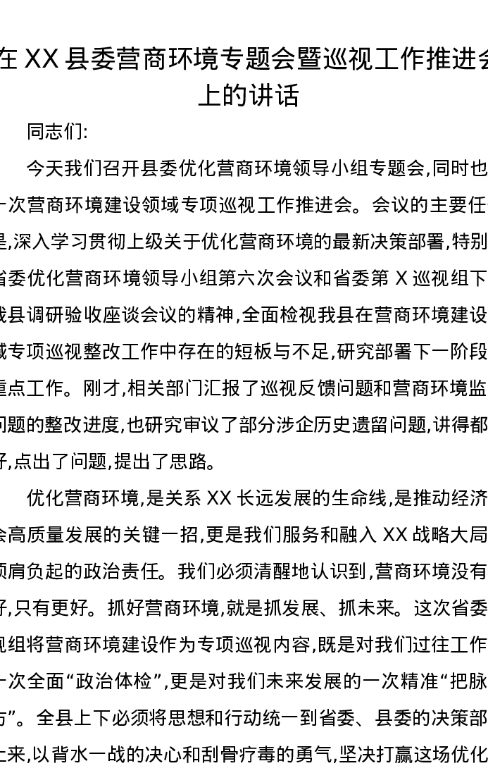 在XX县委营商环境专题会暨巡视工作推进会上的讲话