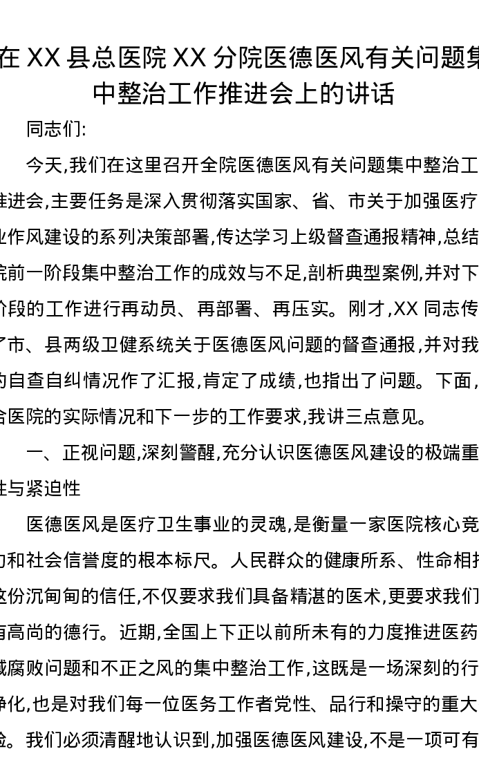 在XX县总医院XX分院医德医风有关问题集中整治工作推进会上的讲话