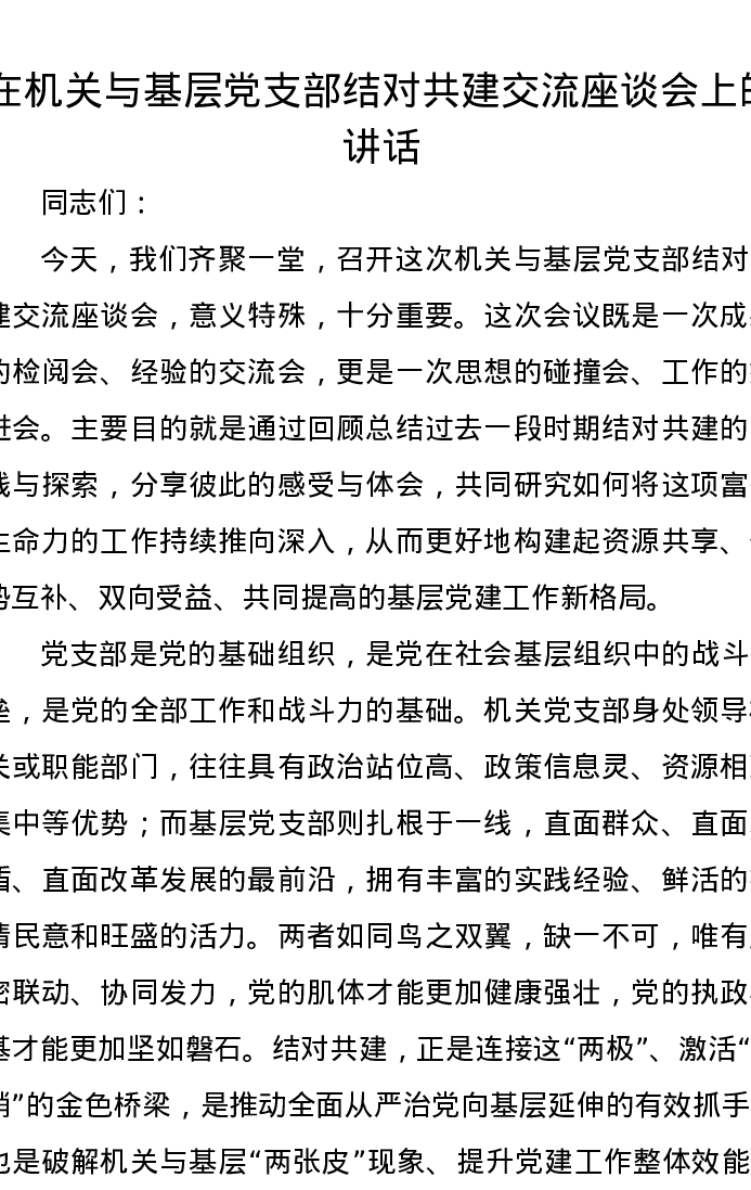 在机关与基层党支部结对共建交流座谈会上的讲话