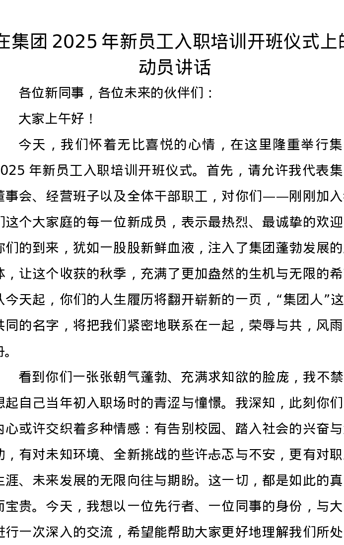 在集团2025年新员工入职培训开班仪式上的动员讲话