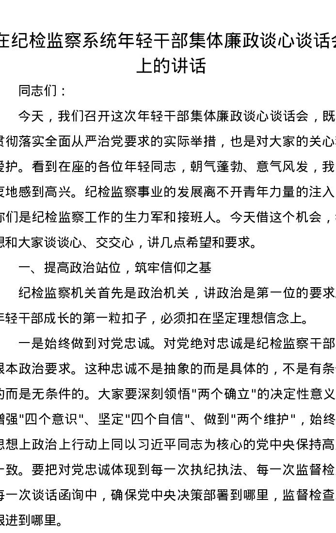在纪检监察系统年轻干部集体廉政谈心谈话会上的讲话